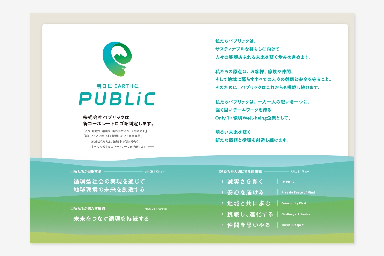 『循環型社会の実現を通じて 地球環境の未来を創造する』というミッションを掲げ、香川県を中心に一般廃棄物・産業廃棄物の収集・運搬・処理・処分からリサイクルまでを一貫して行う事業者、株式会社パブリックのリブランディングに伴い、VI(ビジュアル・アイデンティティ)開発と関連ツールの開発を行いました。
