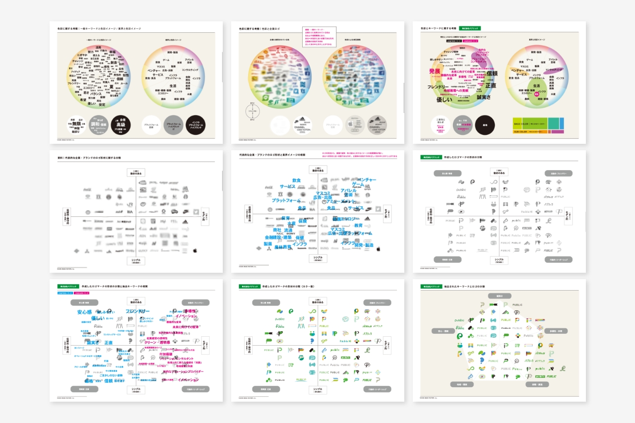 マッチングテスト、分析を経て、展開の難しそうな案を候補から外し、最終的に提案する数をプロデューサーとともに絞り込み、その後、クライアント / プロデューサー側での決定フェーズとして進めてもらいました。この選定は企業の目指すべき真意とロゴの方向性を図るものなので、その際にブランディング関連資料として分析に使用したグラフも一緒に検討材料にしてもらいます。