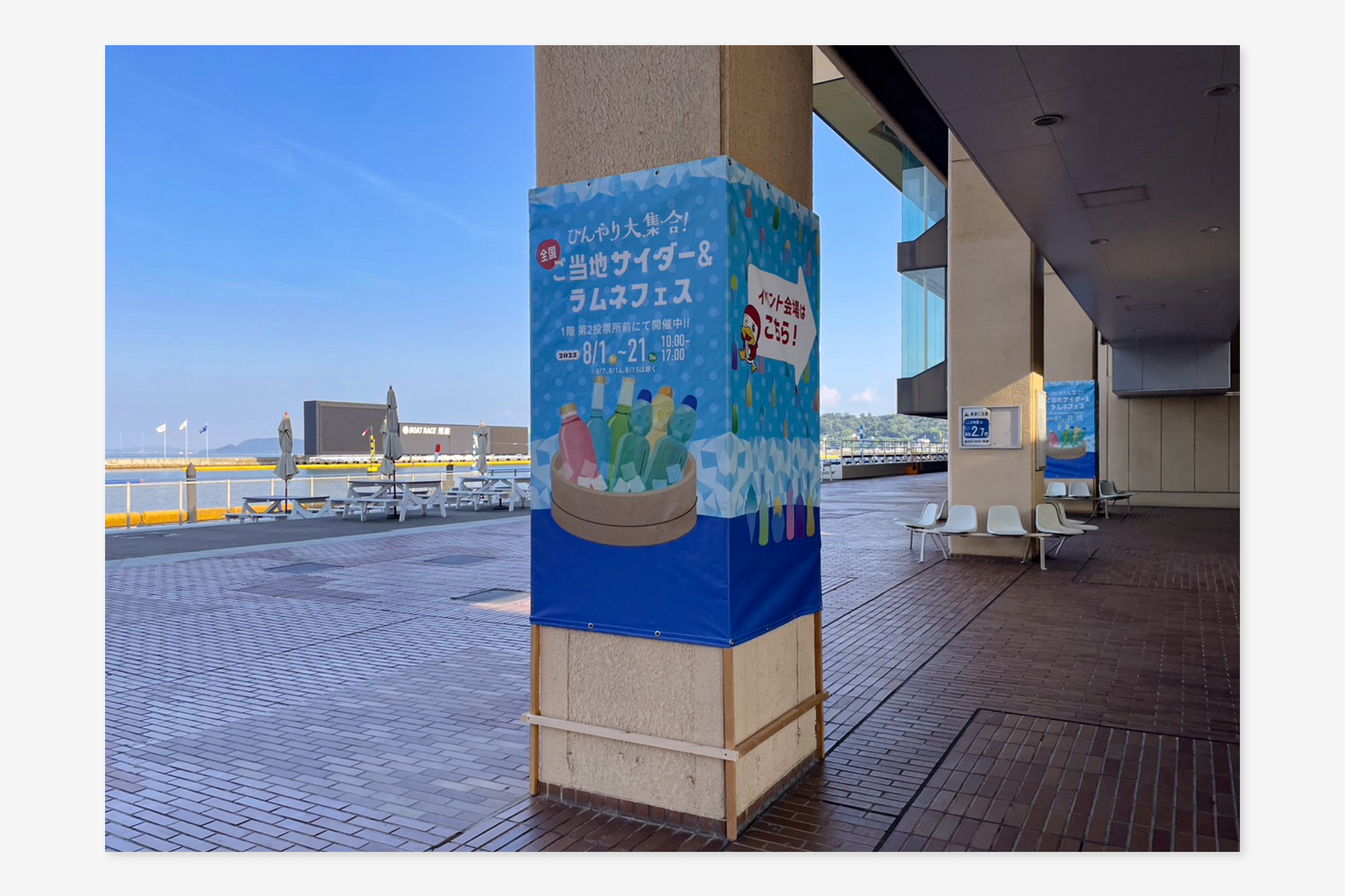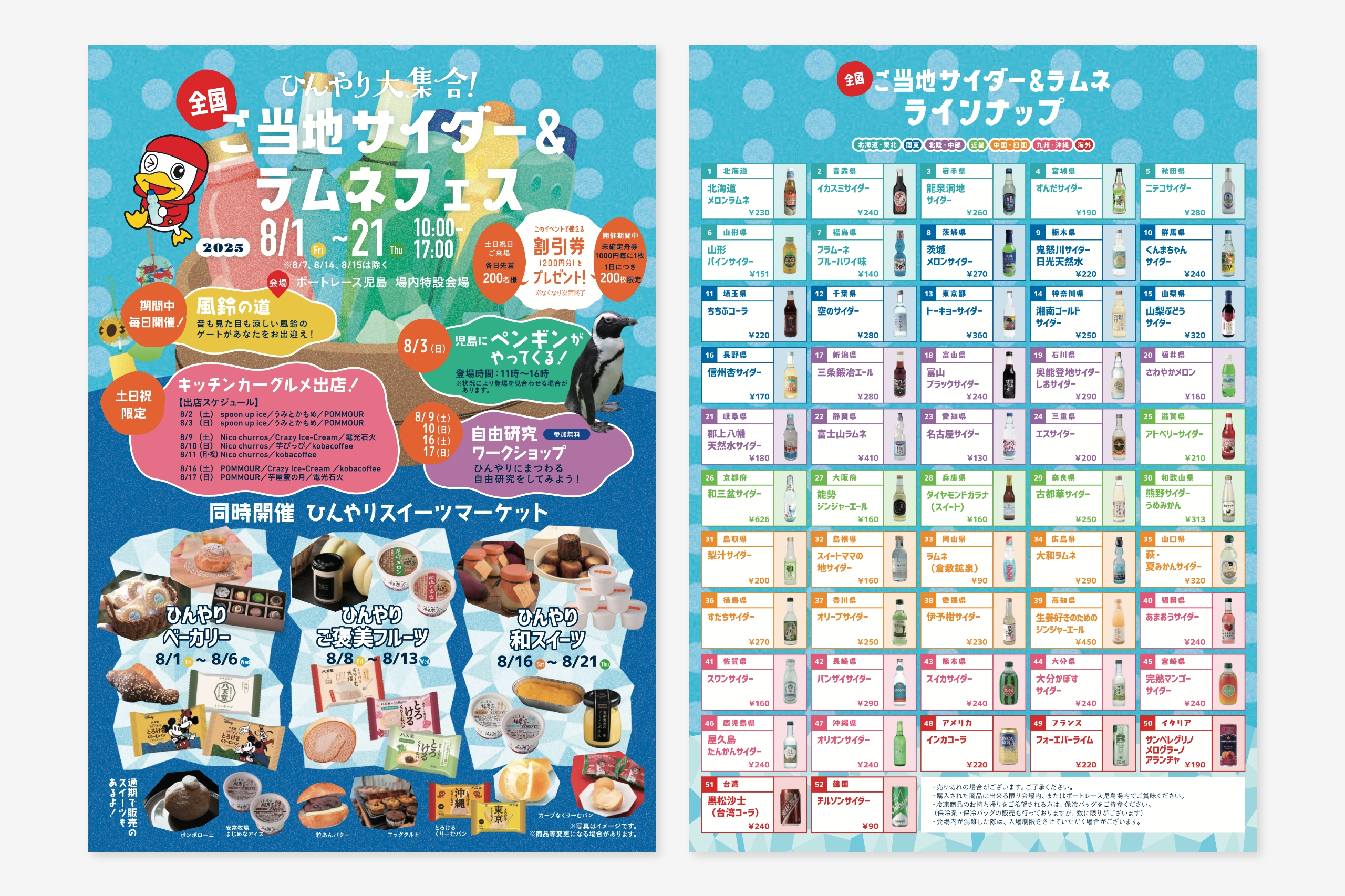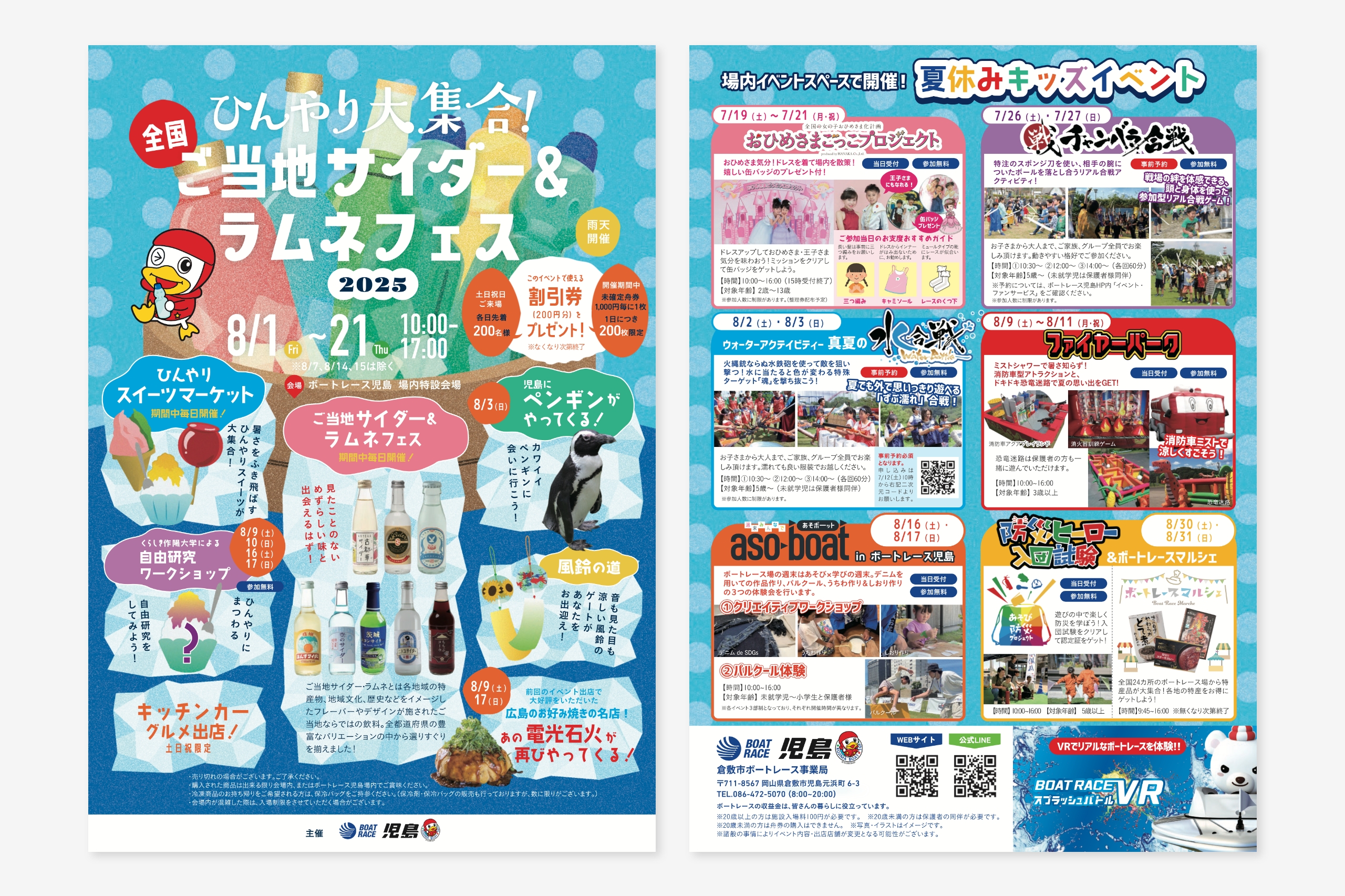 ボートレース児島で2025年の8月に開催された『ひんやり大集合!ご当地サイダー&ラムネフェス』のビジュアル開発・展開ツールの制作を行いました。